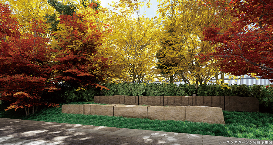 完成予想CGで表現されている植栽は計画段階のものであり、変更になる場合がございます。また葉の色合いや枝ぶりや樹形は想定であり、