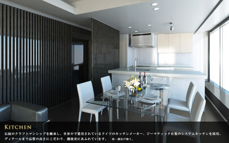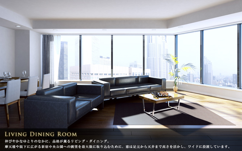 「セントラルパークタワー・ラ・トゥール新宿」地上44階、プレミア住戸。 このプランは、玄関ホールの扉を開くとまず、迎賓の空間が広がっている。 窓一面に広がる夜景。住居面積約290u。大切なゲストをもてなす貴賓室としても相応しいプランである。