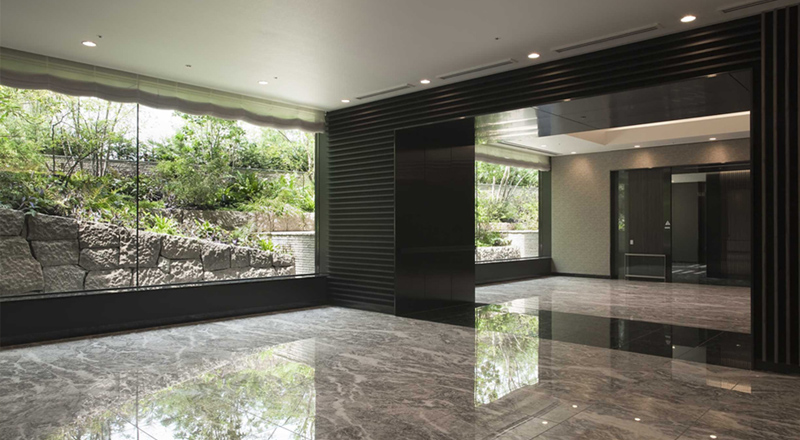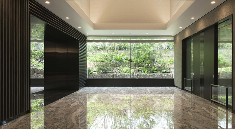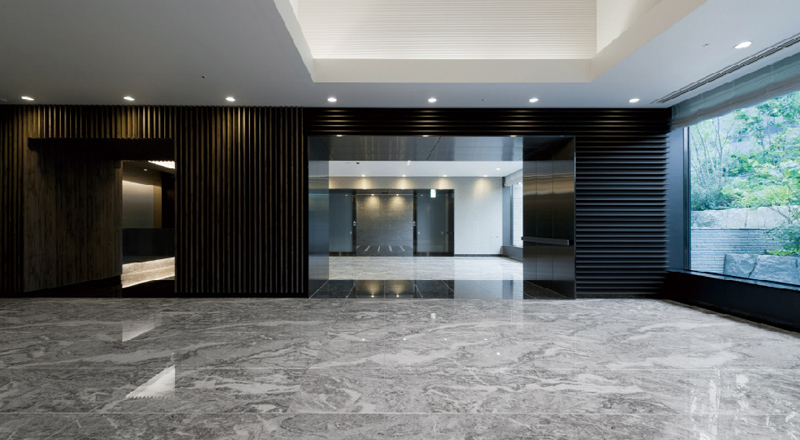 壮麗な吹抜けと自然光が射しこむ大きな窓が、ひときわの開放感を演出するエントランスホールです。 床には天然大理石を貼りこみ、壁は黒を基調にしたリズミカルなルーバーで仕上げ、 気品と格調ある空間を創出しています。