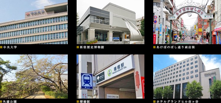 現地からは、都営新宿線「曙橋」駅と東京メトロ丸ノ内線「四谷三丁目」駅の2駅2路線が利用可能。 新宿、銀座、大手町など、都内各地へスムーズに繋がるアクセス環境を実現しています。 徒歩圏内には多くの店舗が建ち並ぶ「あけぼのばし通り商店街」をはじめ、駅を中心に商業施設も充実。 少し足を延ばせば、「外濠公園」や「新宿御苑」といった豊かな自然スポットにも訪れることもできます。