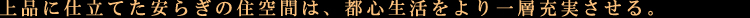 本物件では居住者のスタイルを限定しない、ナチュラルカラーのシンプルかつ洗練された住空間を目指しました。 丁寧に配慮を織り重ねて創り上げられた安らぎの住まいが、自由と愉しみをもたらす。 ここでの暮らしは、都心生活をより一層豊かなものへと変えてくれることでしょう。