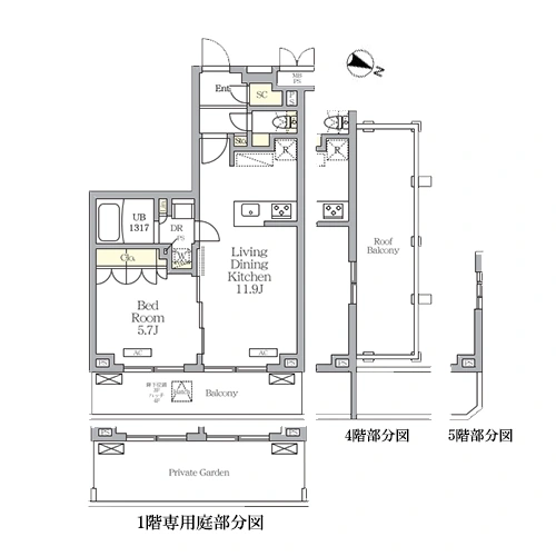 1DK(13戸) / 1LDK(10戸) / 1SLDK(1戸) / 2LDK(48戸) / 3LDK(5戸)