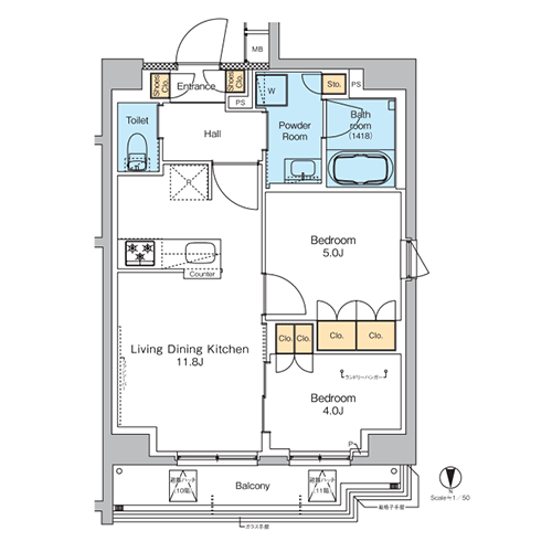 間取りは約25㎡の1K・1R・1DKが中心。1K・1Rは7畳以上の居室を確保し、各種設備もバランス良く配置されています。 1DKはコンパクトでありながらダイニングとベッドルームの使い分けが可能なため、 単身者から高い支持を集める人気の間取りです。 また、上層階の一部住戸にはDINKS・ファミリー向けの2LDKを採用しました。 こちらでは、東京スカイツリーを望む優れた眺望とカウンターキッチン付きのリビングが魅力的です。